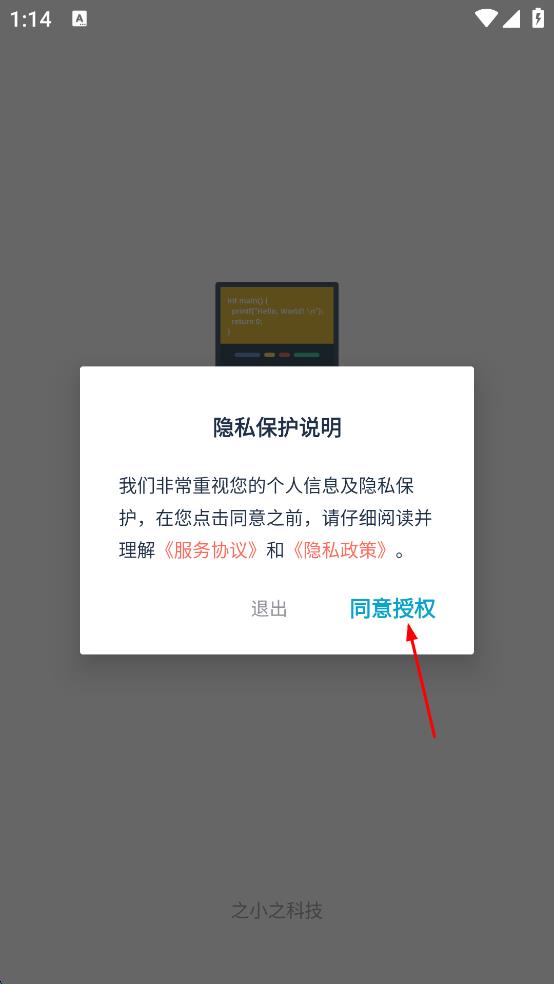 1、打開編程小之應(yīng)用,會彈出隱私保護說明頁面,仔細(xì)閱讀后點擊同意授權(quán)按鈕。