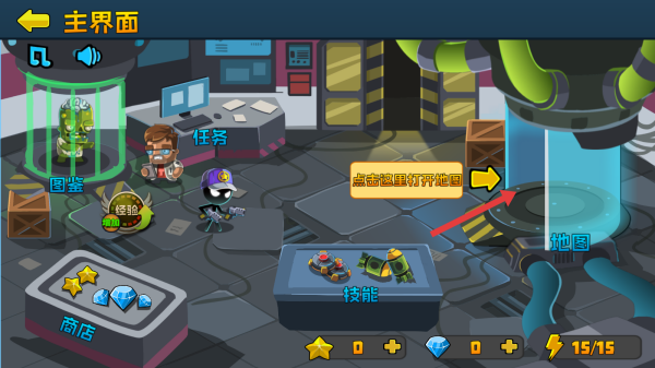 2、在主界面中點(diǎn)擊箭頭所指的“地圖”區(qū)域,開啟游戲地圖,選擇關(guān)卡。