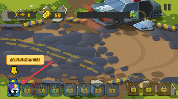 3、進(jìn)入關(guān)卡1后,點(diǎn)擊箭頭所指的火柴人頭像,創(chuàng)建火柴人角色,開始抵御僵尸進(jìn)攻。