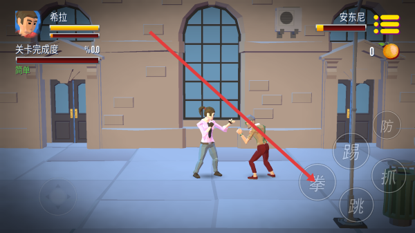 2、游戲中操控角色(如希拉),使用右側(cè)“拳”等按鈕進(jìn)行攻擊,與敵人(如安東尼)戰(zhàn)斗,注意角色狀態(tài)和關(guān)卡完成度。
