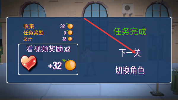 3、完成任務(wù)后,界面顯示任務(wù)完成,可選擇【下一關(guān)】繼續(xù)游戲,或通過(guò)看視頻等方式獲取獎(jiǎng)勵(lì)(如橙子、愛(ài)心)。