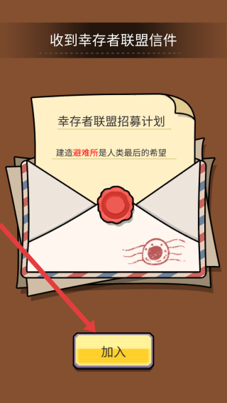 2、看到【收到幸存者聯(lián)盟信件】后點(diǎn)擊【加入】按鈕響應(yīng)【幸存者聯(lián)盟招募計(jì)劃】參與【建造避難所】。