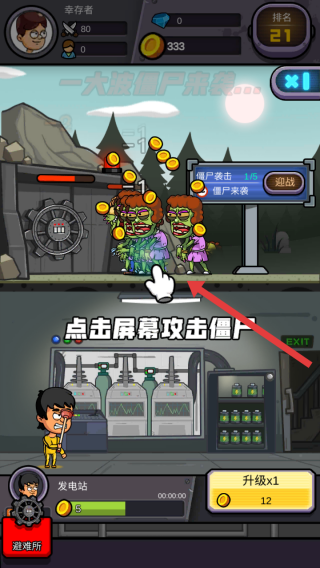 3、在游戲戰(zhàn)斗界面按照提示【點(diǎn)擊屏幕攻擊僵尸】抵御僵尸進(jìn)攻并利用金幣進(jìn)行設(shè)施【升級】。