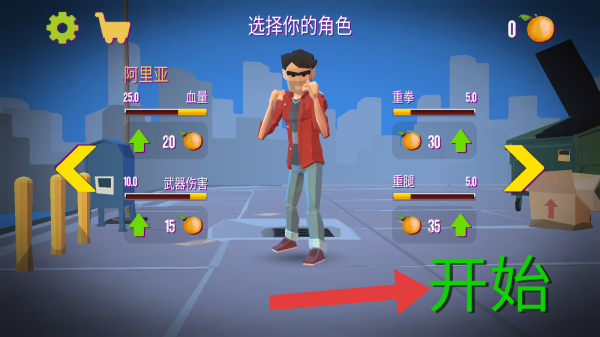1、實體信息有角色“阿里亞”,以及血量、武器傷害、重拳、重腿等屬性數(shù)值,還有【開始】按鈕用于進入游戲。