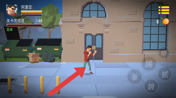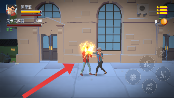 2、實體信息有角色“阿里亞”,顯示關(guān)卡完成度、難度(簡單),還有“防、踢、拳、抓、跳”操作按鈕。