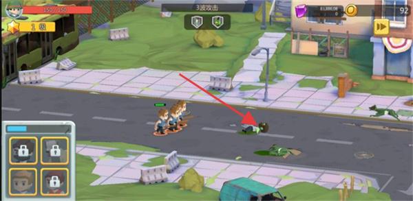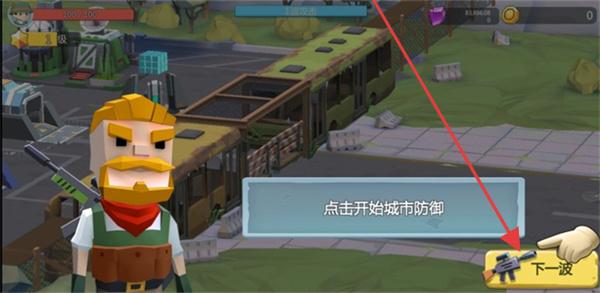 1、點擊“下一波”,觸發(fā)僵尸進攻,開啟“城市防御”,布置防線,用角色(黃發(fā)帶槍)射擊,阻止僵尸突破。