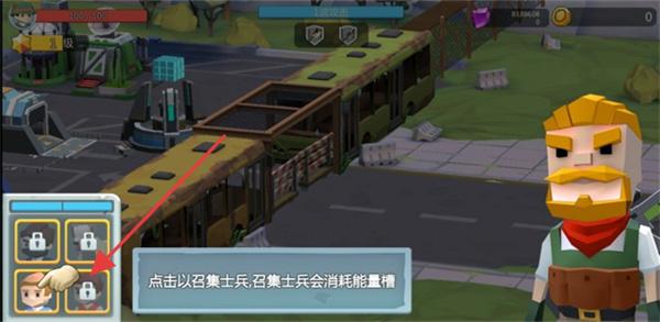 2、點擊紅箭頭“士兵圖標”,消耗“能量槽”,招募士兵(如基礎(chǔ)兵種),部署到街道,協(xié)助防御,抵擋僵尸潮。