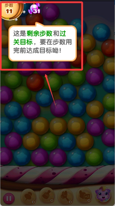 4、右上角會顯示剩余步數(shù)和過關(guān)目標(biāo),我們需要在步數(shù)用完前達到目標(biāo)。