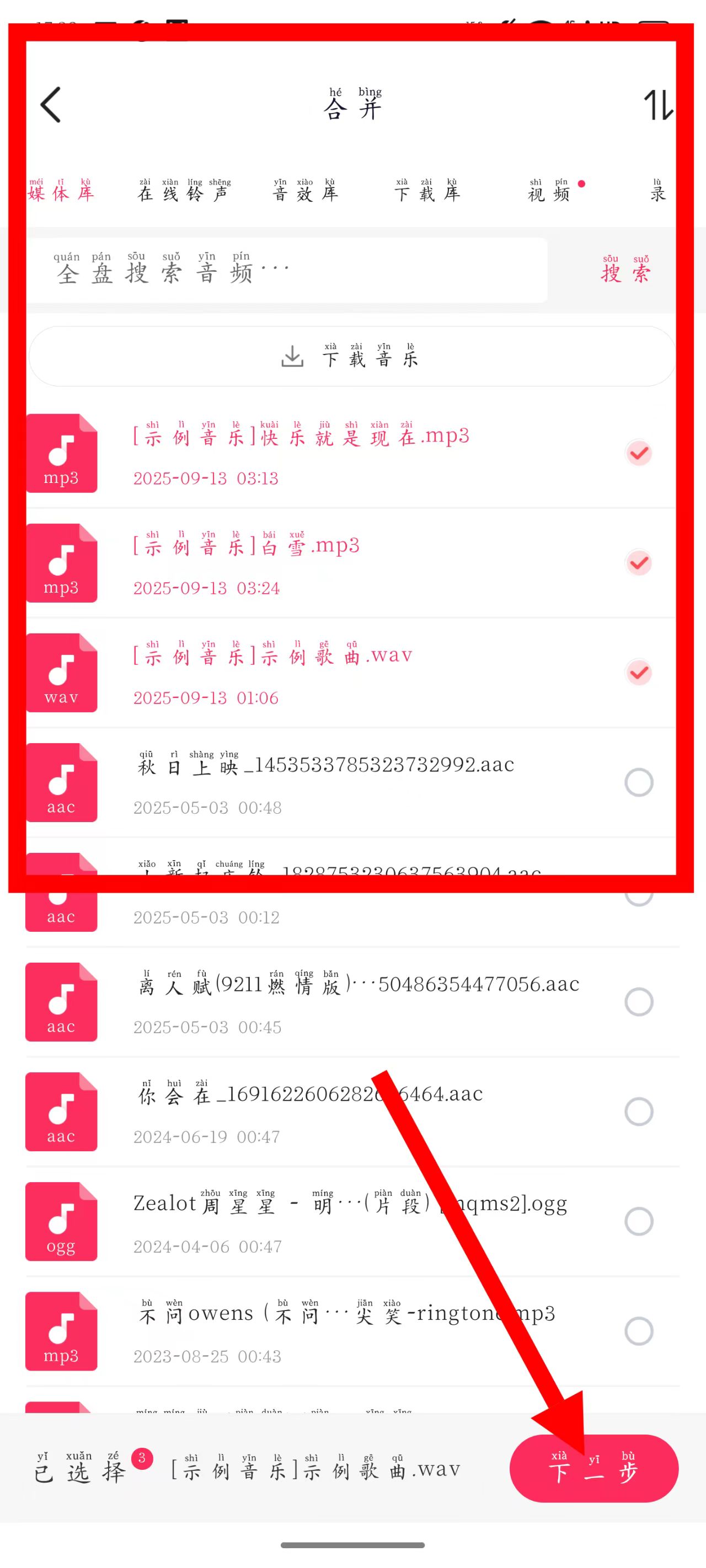 3、挑選需要合并的音頻文件,選好后點擊下一步,進入音頻合并編輯頁面。