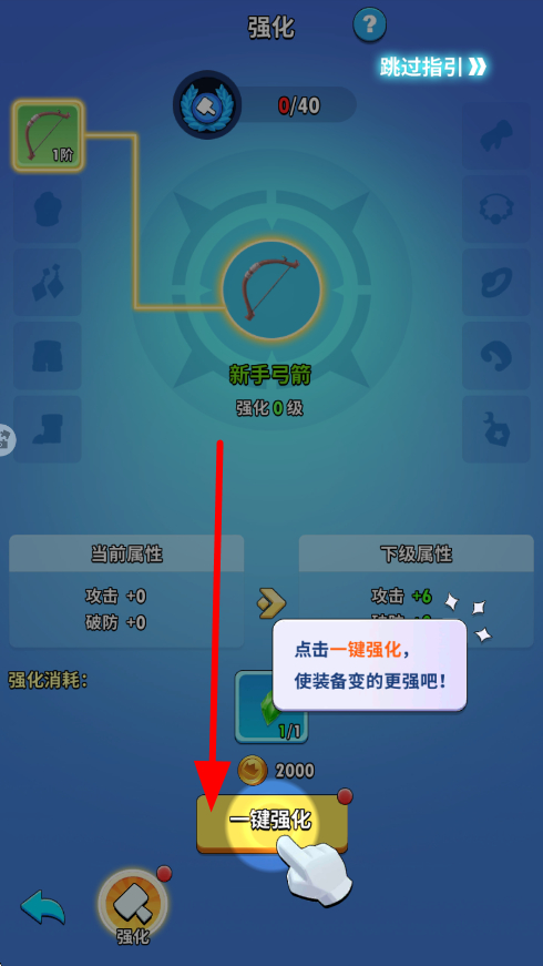3、裝備強(qiáng)化界面,可對(duì)裝備進(jìn)行強(qiáng)化操作,點(diǎn)擊一鍵強(qiáng)化按鈕,消耗相應(yīng)材料與貨幣,能快速提升裝備屬性,增強(qiáng)角色實(shí)力。
