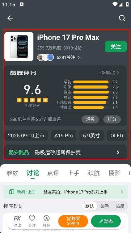 4、在手機詳情頁面,可查看該手機的酷安評分、上市時間等信息。