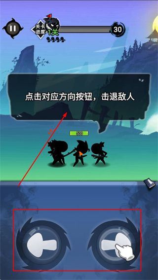 1、進(jìn)入戰(zhàn)斗界面,根據(jù)提示點擊對應(yīng)方向按鈕,操控火柴人擊退敵人,展開功夫?qū)Q。