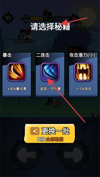 2、通過一關(guān)后,會出現(xiàn)秘籍選擇界面,可從隨機(jī)的三個秘籍中挑選,為后續(xù)戰(zhàn)斗助力。
