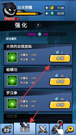3、進(jìn)入強(qiáng)化界面,能看到大俠的自我放、蛤蟆功等技能,點擊參悟可提升技能的血量、攻擊等屬性,強(qiáng)化角色戰(zhàn)力。