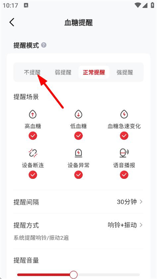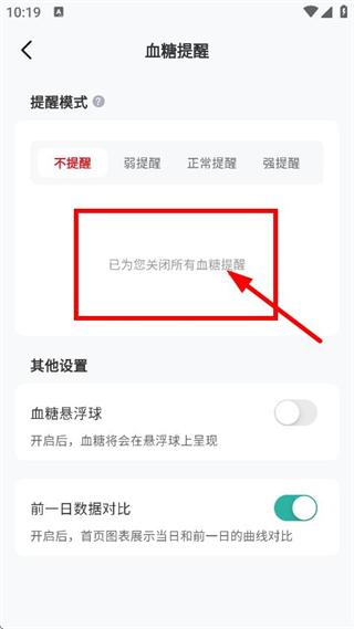 3、血糖提醒設(shè)置頁面,點擊不提醒,選擇關(guān)閉提醒模式。