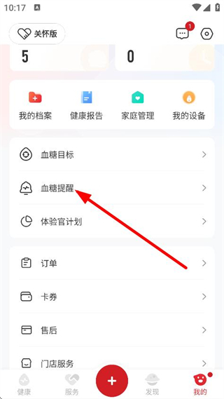 2、在個人頁面,點擊血糖提醒,進(jìn)入血糖提醒設(shè)置頁面。