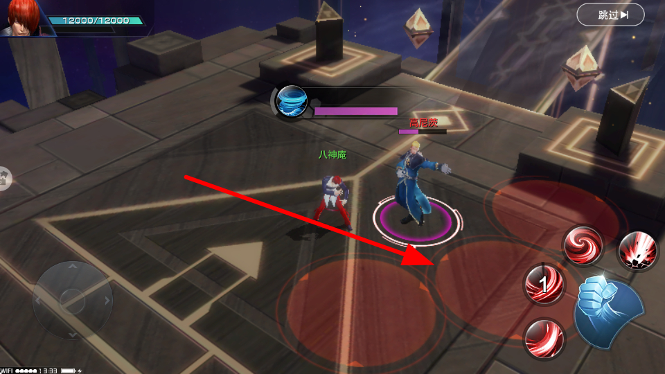 1、玩家移動靠左側(cè)搖桿,能控制八神庵在戰(zhàn)斗場景中前進、后退、向左或向右移動。