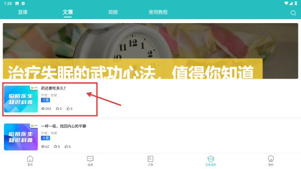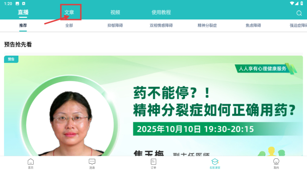 2、在名醫(yī)課堂頁面,點(diǎn)擊文章分類標(biāo)簽,切換到科普文章列表。