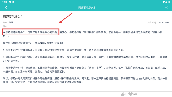 4、在文章詳情頁,查看關(guān)于精神藥物服用時(shí)長的專業(yè)解讀,三個階段說明。
