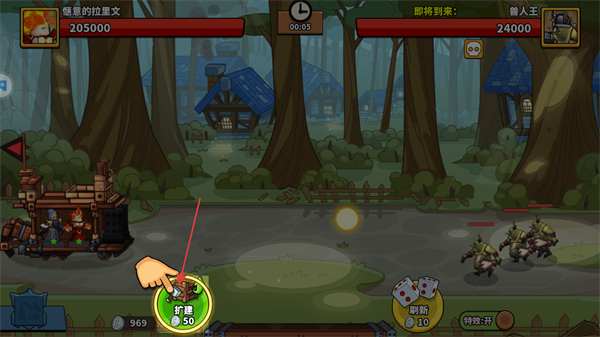 1、進(jìn)入游戲,觀察界面上方顯示的我方與敵方血量條,如憤怒的拉里文205000血量,獸人王24000血量,留意剩余時(shí)間。