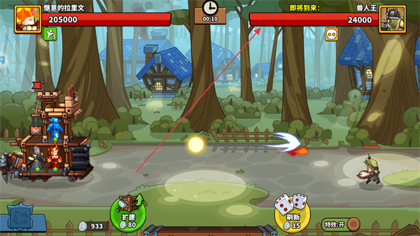 3、密切關(guān)注敵方,如獸人等怪物的進(jìn)攻動(dòng)向,利用我方防御塔和精靈角色自動(dòng)攻擊敵人,削減敵方血量。