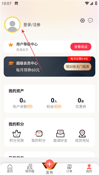 2、在個(gè)人頁面,點(diǎn)擊頭像區(qū)域,進(jìn)入登錄注冊(cè)頁面。