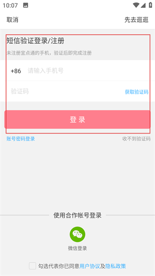 3、在登錄注冊(cè)頁面,輸入信息,勾選協(xié)議后點(diǎn)擊登錄完成登錄操作。