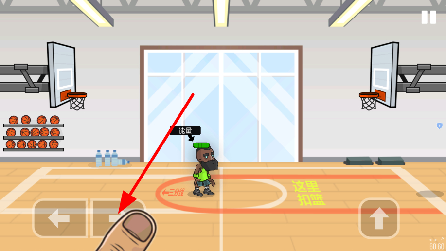 1、點(diǎn)擊左側(cè)的方向按鍵,能操控角色在球場(chǎng)上左右移動(dòng),調(diào)整到合適的位置。