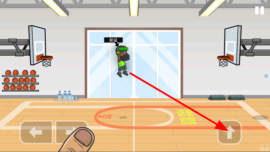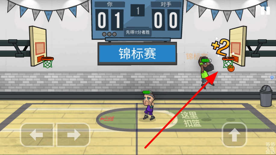 2、點(diǎn)擊右側(cè)的向上按鍵,游戲的角色會(huì)向上面躍起,準(zhǔn)備進(jìn)行扣籃投籃等動(dòng)作。
