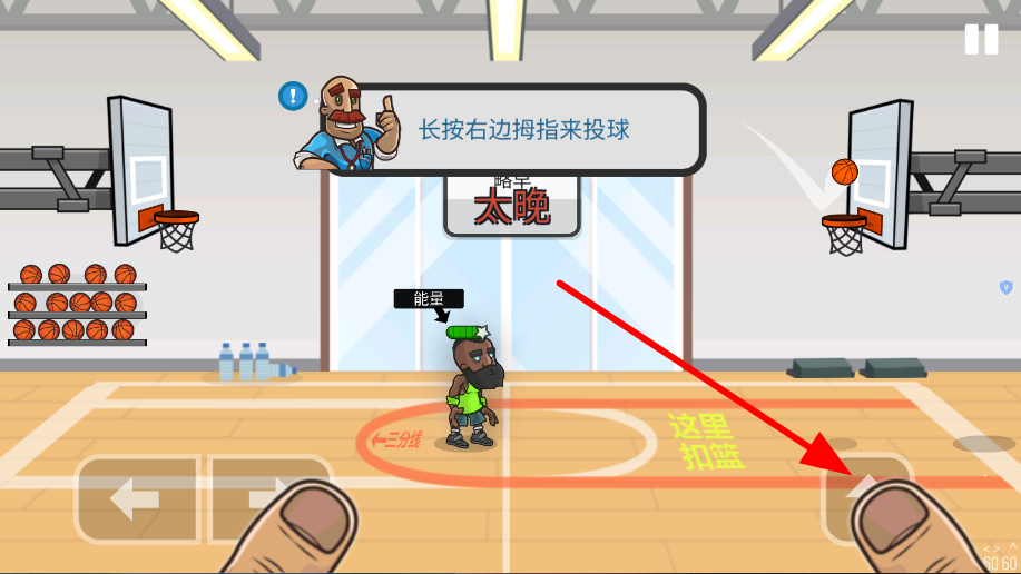 3、長(zhǎng)按右側(cè)的投球按鍵,角色能將球投出,不過要注意投球時(shí)機(jī),避免太晚。