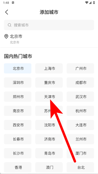 3、進(jìn)入添加城市頁面,點(diǎn)擊天津市。