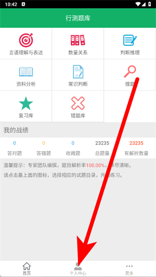 2、進入行測題庫主界面,點擊底部個人中心。