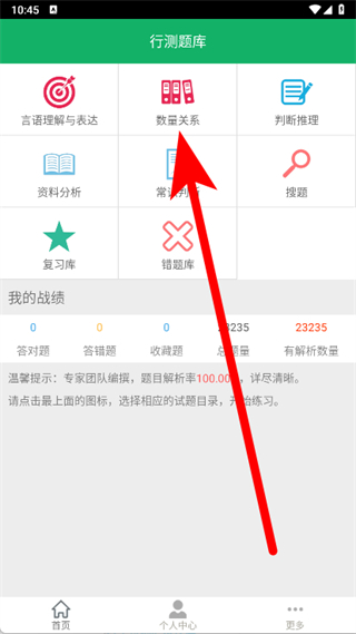 1、打開(kāi)行測(cè)題庫(kù),點(diǎn)擊數(shù)量關(guān)系模塊。
