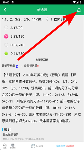 5、點(diǎn)擊單選題題目進(jìn)行答題,點(diǎn)擊右上角星形圖標(biāo)收藏題目。