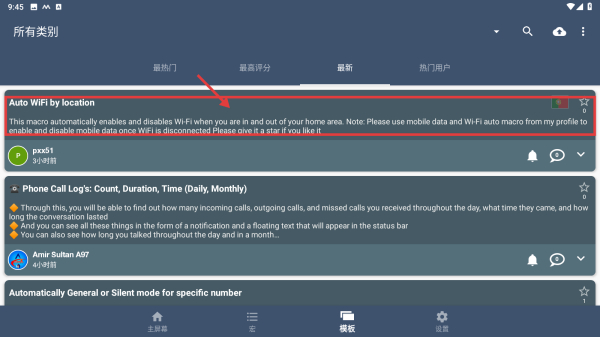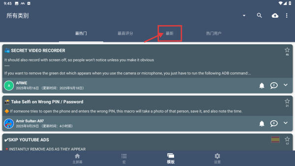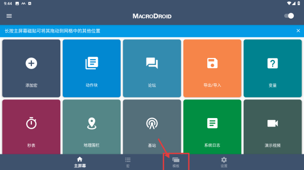 1、打開MacroDroid-APP,點擊底部模板選項,進入模板頁面。