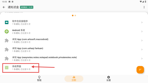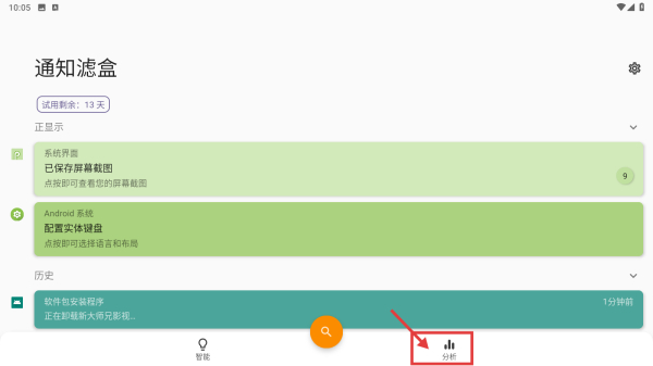 1、打開通知濾盒APP,點(diǎn)擊底部分析選項(xiàng),進(jìn)入通知分析頁面。