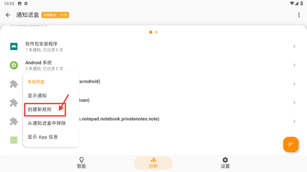2、在通知分析頁面,長按系統(tǒng)界面通知條目,彈出操作菜單。