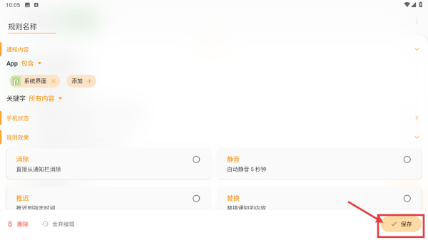 4、在規(guī)則設(shè)置頁面,配置規(guī)則名稱、通知內(nèi)容、App包含等信息后,點(diǎn)擊右下角保存按鈕,完成通知規(guī)則的創(chuàng)建。