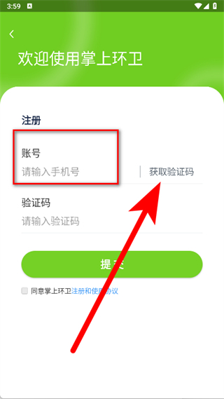 3、在注冊頁面,輸入手機(jī)號(hào),接著點(diǎn)擊獲取驗(yàn)證碼。