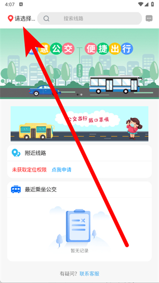 1、打開公交e出行,點擊頁面左上角請選擇,完成城市選擇設(shè)置。
