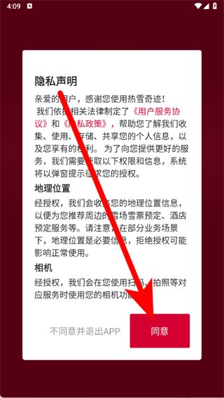 1、打開熱雪奇跡,在彈出的隱私聲明窗口中點(diǎn)擊同意。