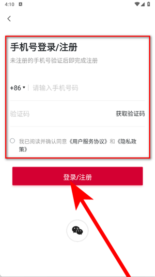 4、輸入手機(jī)號(hào)碼,點(diǎn)擊獲取驗(yàn)證碼,輸入收到的驗(yàn)證碼,勾選后,點(diǎn)擊登錄注冊(cè)按鈕,完成注冊(cè)操作。