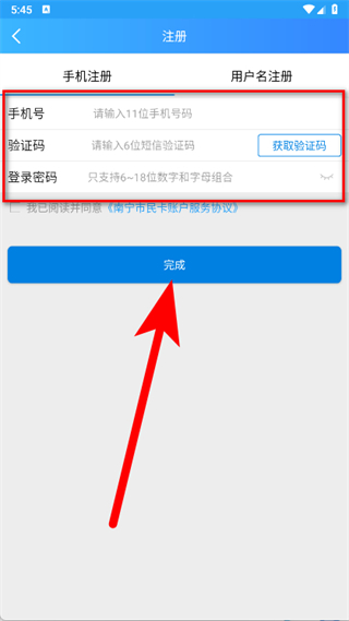 4、輸入11位手機(jī)號(hào)碼,點(diǎn)擊獲取驗(yàn)證碼,點(diǎn)擊完成按鈕,完成賬號(hào)注冊(cè)。