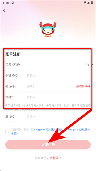 4、依次輸入手機(jī)號(hào)碼,點(diǎn)擊獲取驗(yàn)證碼等信息,點(diǎn)擊立即注冊(cè)按鈕,完成賬號(hào)注冊(cè)。