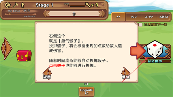 1、進(jìn)入游戲界面,了解Stage1的基本操作,右側(cè)勇氣骰子可點(diǎn)擊投擲,也能隨時(shí)間自動(dòng)投擲對(duì)敵人造成傷害。