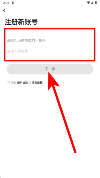 4、在注冊(cè)新賬號(hào)頁(yè)面,輸入正確格式的手機(jī)號(hào),勾選后,點(diǎn)擊下一步,完成注冊(cè)。