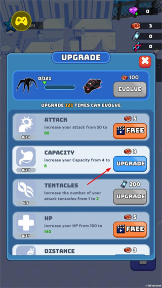 3、升級蜘蛛的各項屬性,提升蜘蛛的收集和戰(zhàn)斗能力,還可進化蜘蛛形態(tài)。