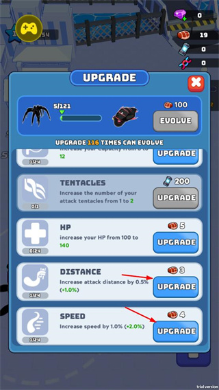1、升級(jí)毒液的觸須數(shù)量、生命值攻擊距離、移動(dòng)速度等屬性,提升收集與戰(zhàn)斗能力。
