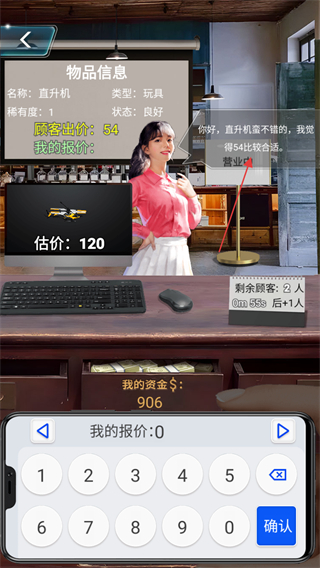 2、針對顧客出價(jià)的物品如直升機(jī)玩具,顧客出價(jià)54,結(jié)合物品估價(jià)120,輸入你的報(bào)價(jià)如60,點(diǎn)擊確認(rèn)。