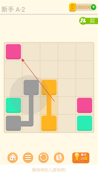 2、連線時(shí)需繞過(guò)其他顏色的方塊和路徑,確保連線不交叉、不重疊,且能填滿整個(gè)網(wǎng)格的空白區(qū)域。